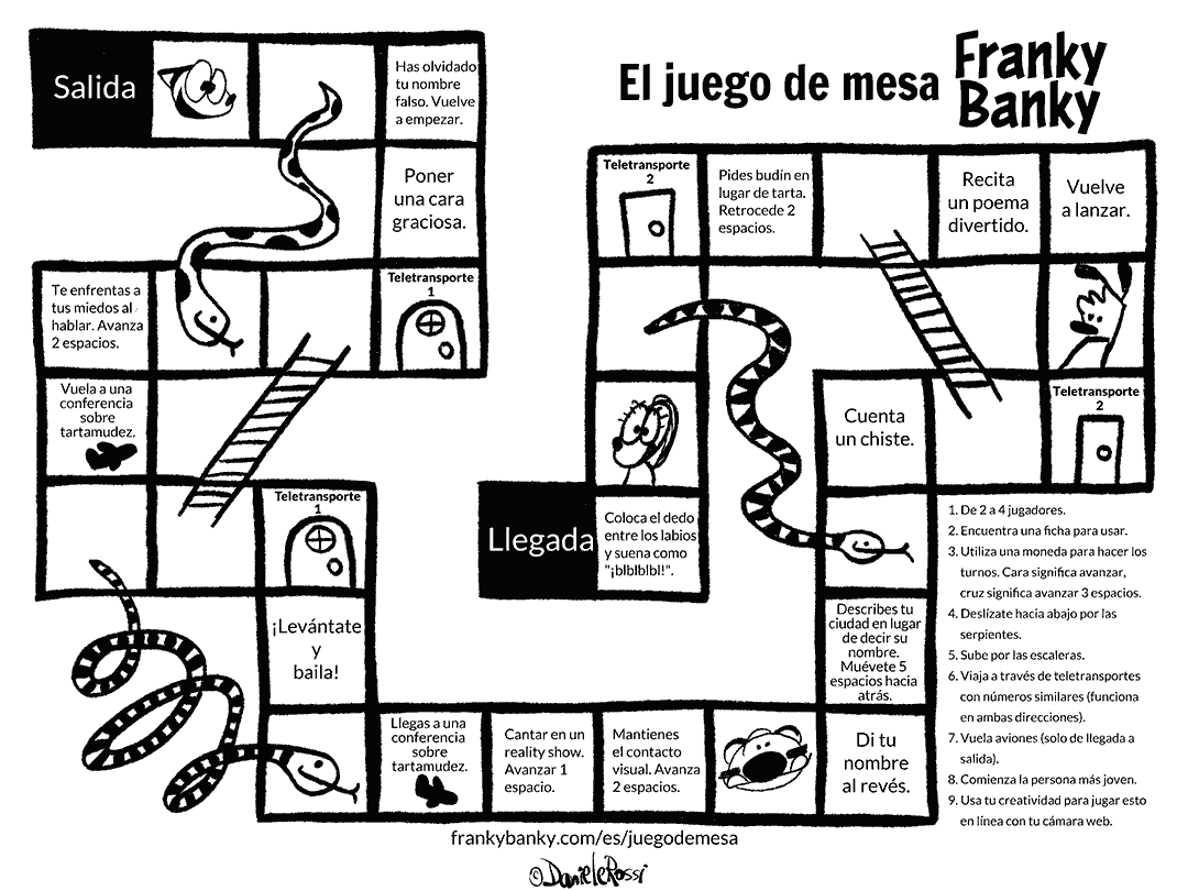 Cuando era niño me gustaba crear mis propios juegos de mesa. Retomé esa alegría creando un juego de mesa Franky Banky en francés para el número de diciembre de 2020 del boletín de Association bégaiement communication. De hecho, tuve un poco de ayuda de los miembros de la ABC, Audrey Bigras y Jean-François Leblanc, en la creación de este juego de mesa.